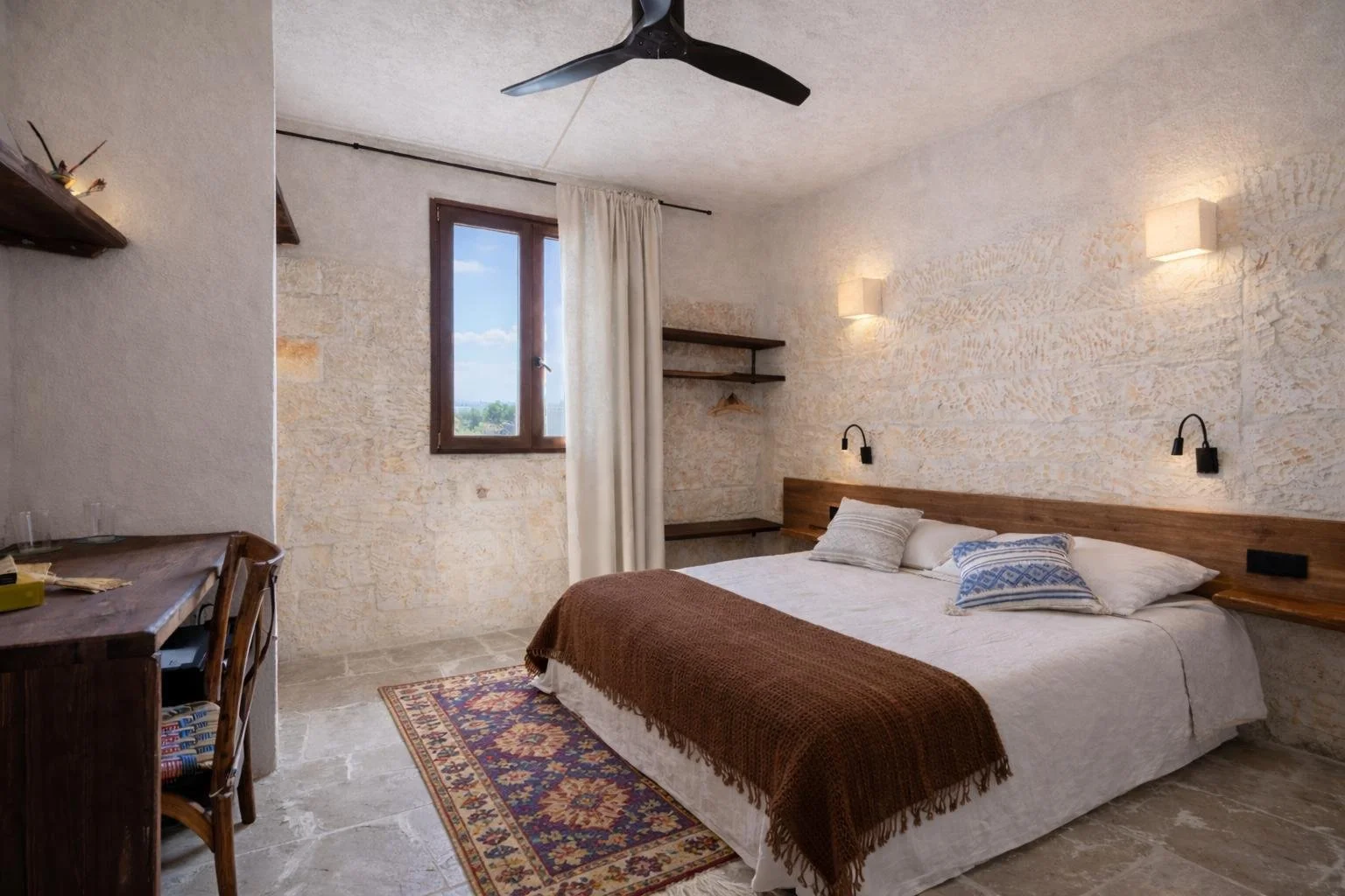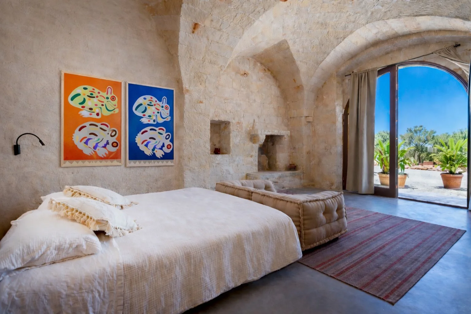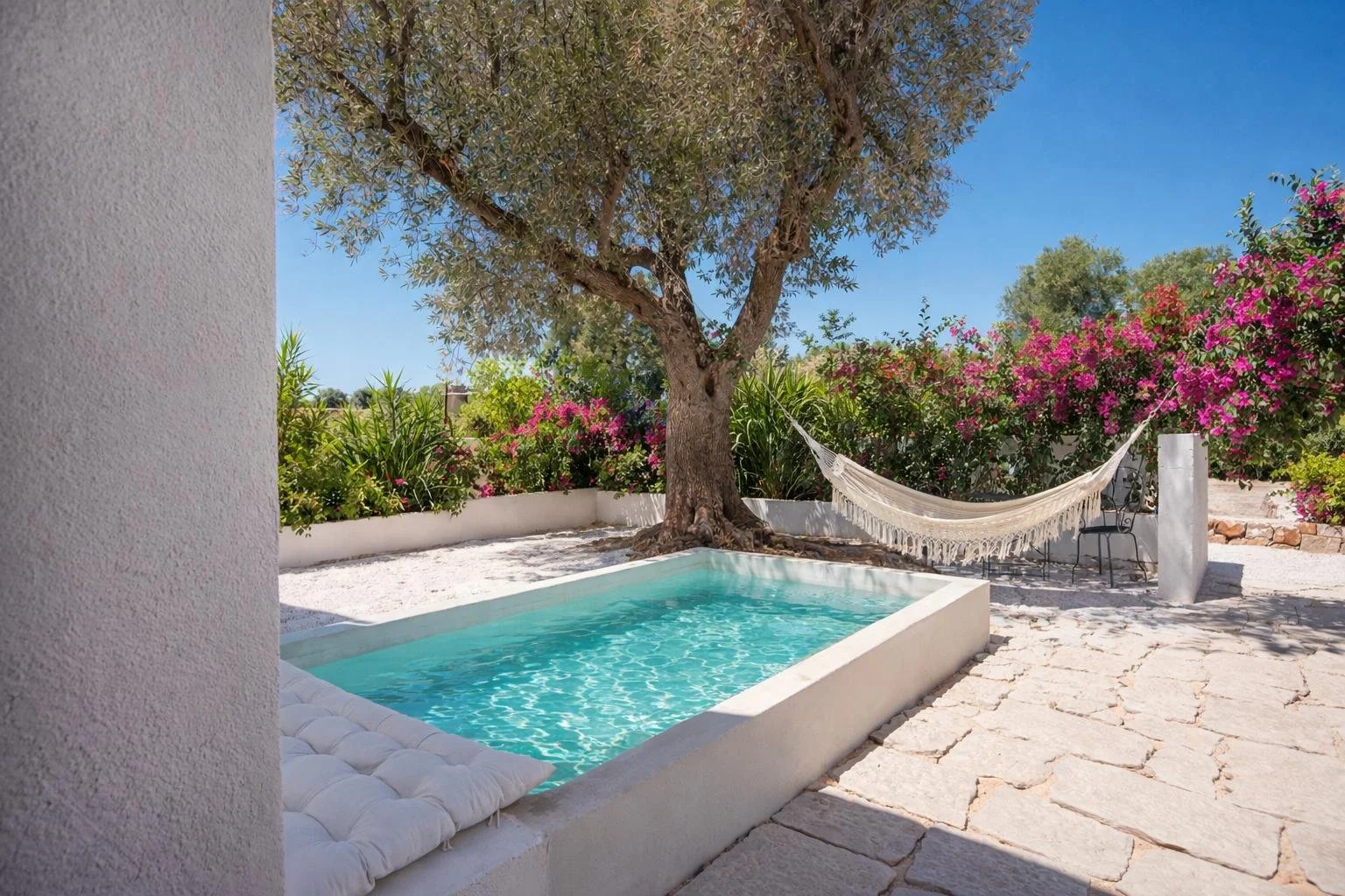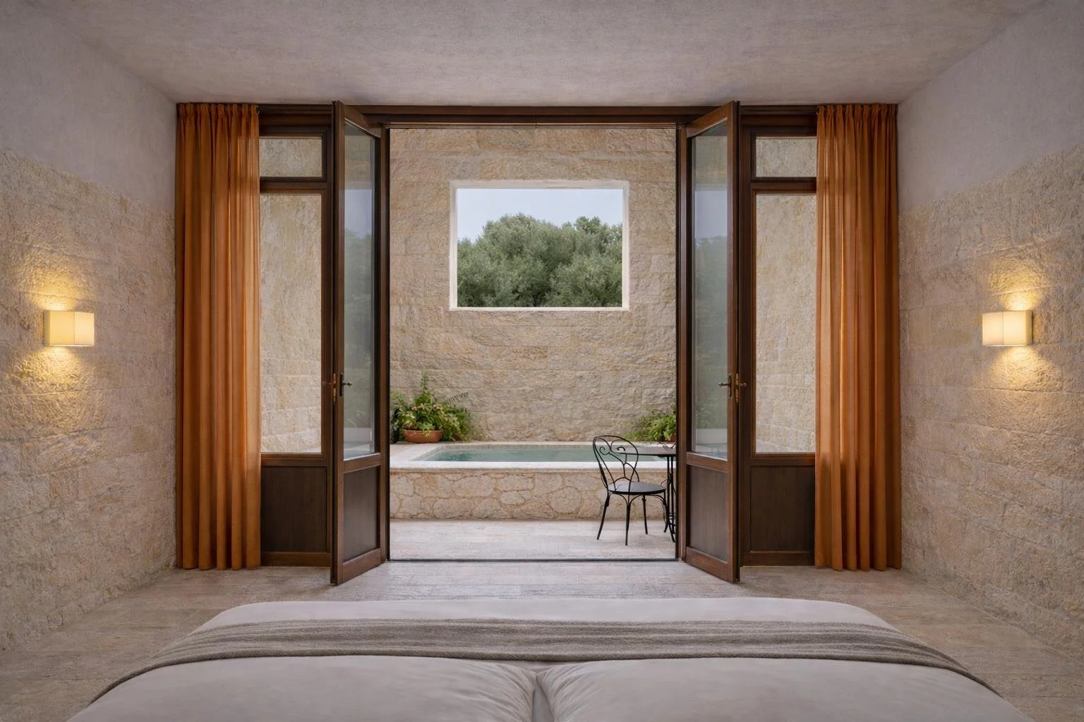 A serene retreat on the ground floor in Apulia’s countryside, with exposed stone walls, vaulted ceilings, and handcrafted furnishings. Outside, a private courtyard with a plunge pool and Mediterranean greenery provides a peaceful escape.